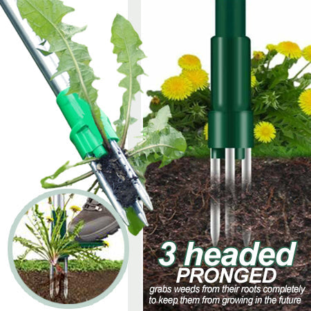This tool grabs weeds from their roots completely with a 3-pronged head to keep them from growing in the future.